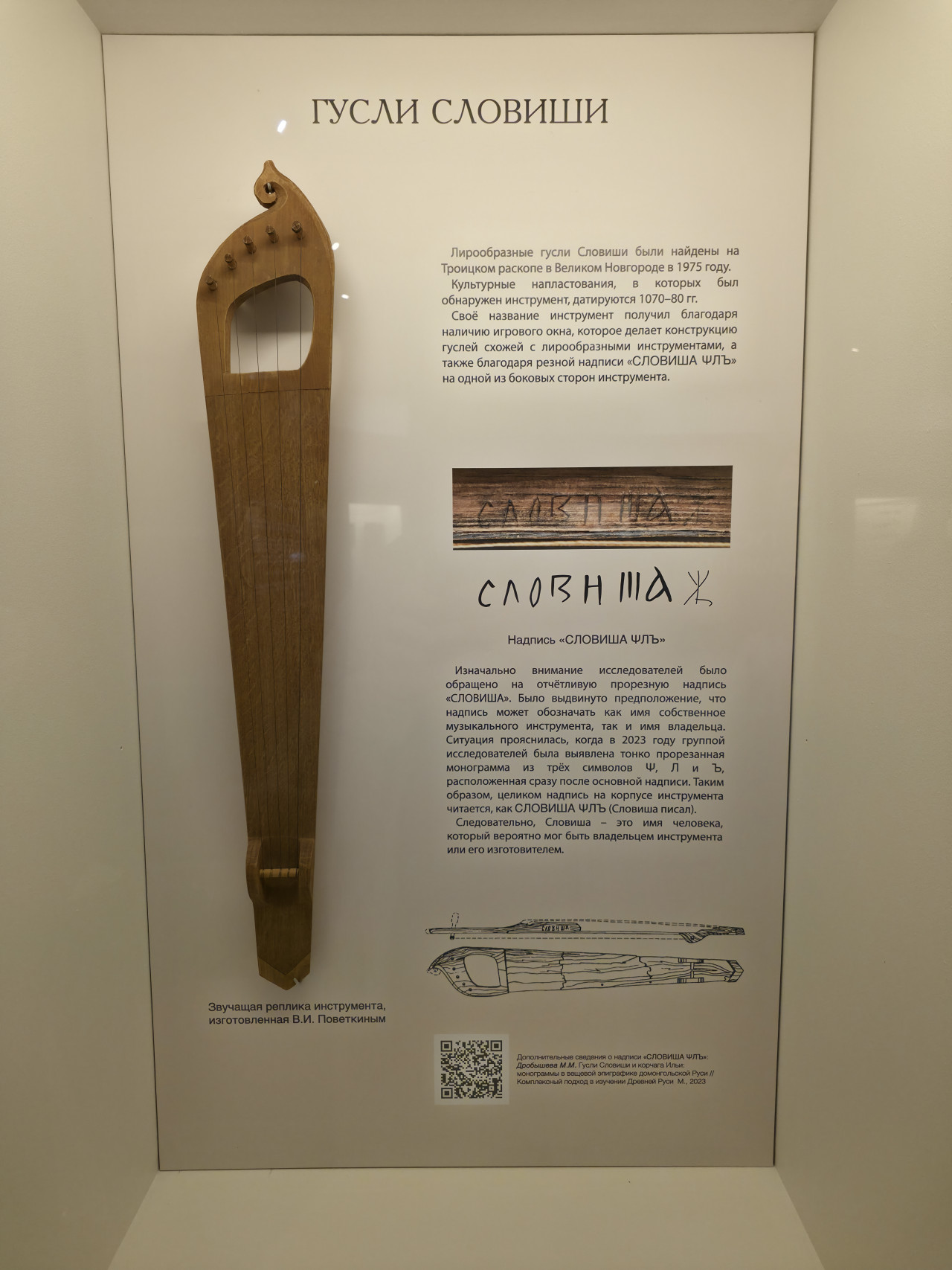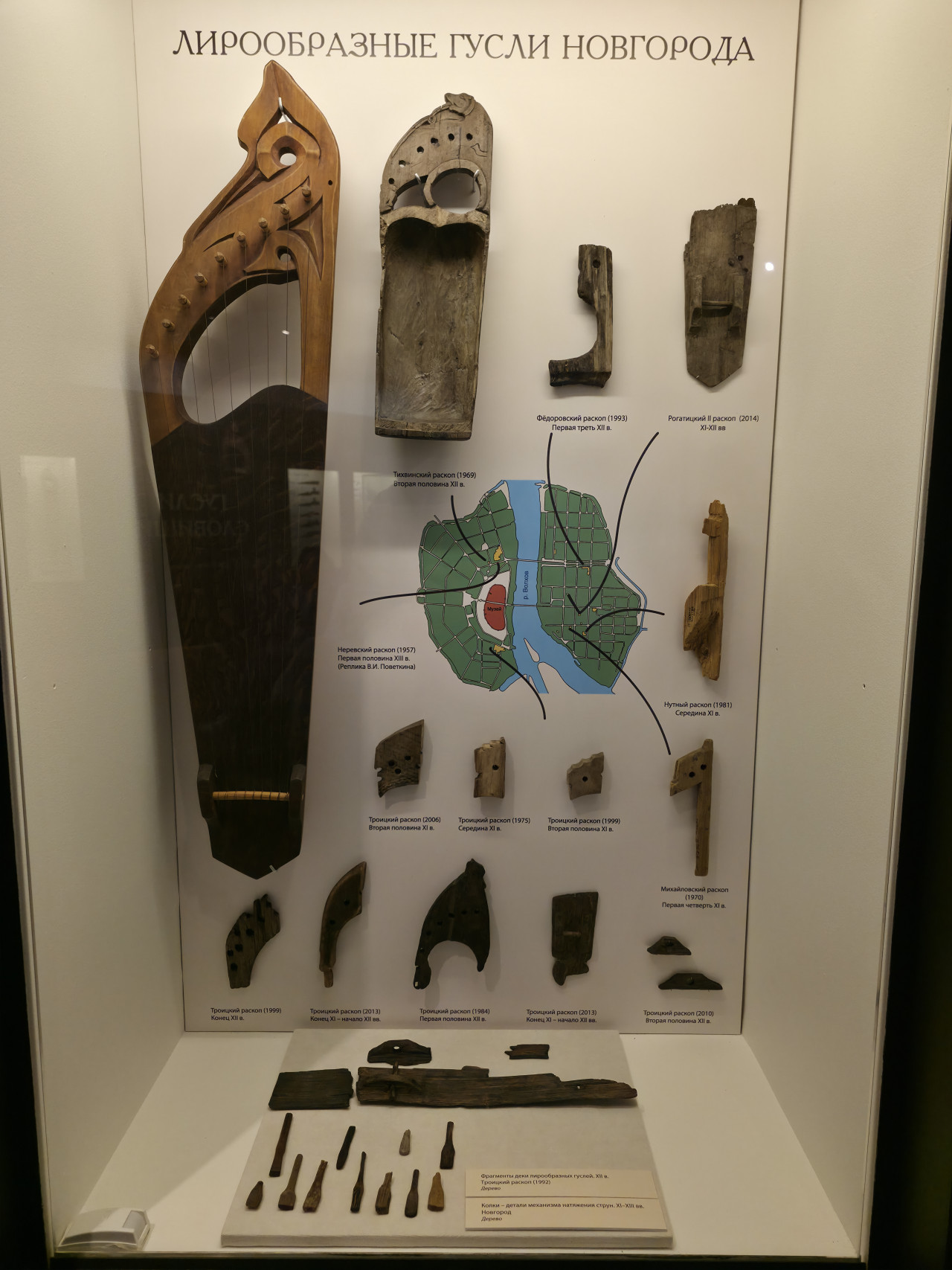 В Великом Новгороде проходит выставка, посвящённая истории открытия и изучения лирообразных гуслей XI века, обнаруженных в 1975 году на Троицком раскопе в Великом Новгороде.
