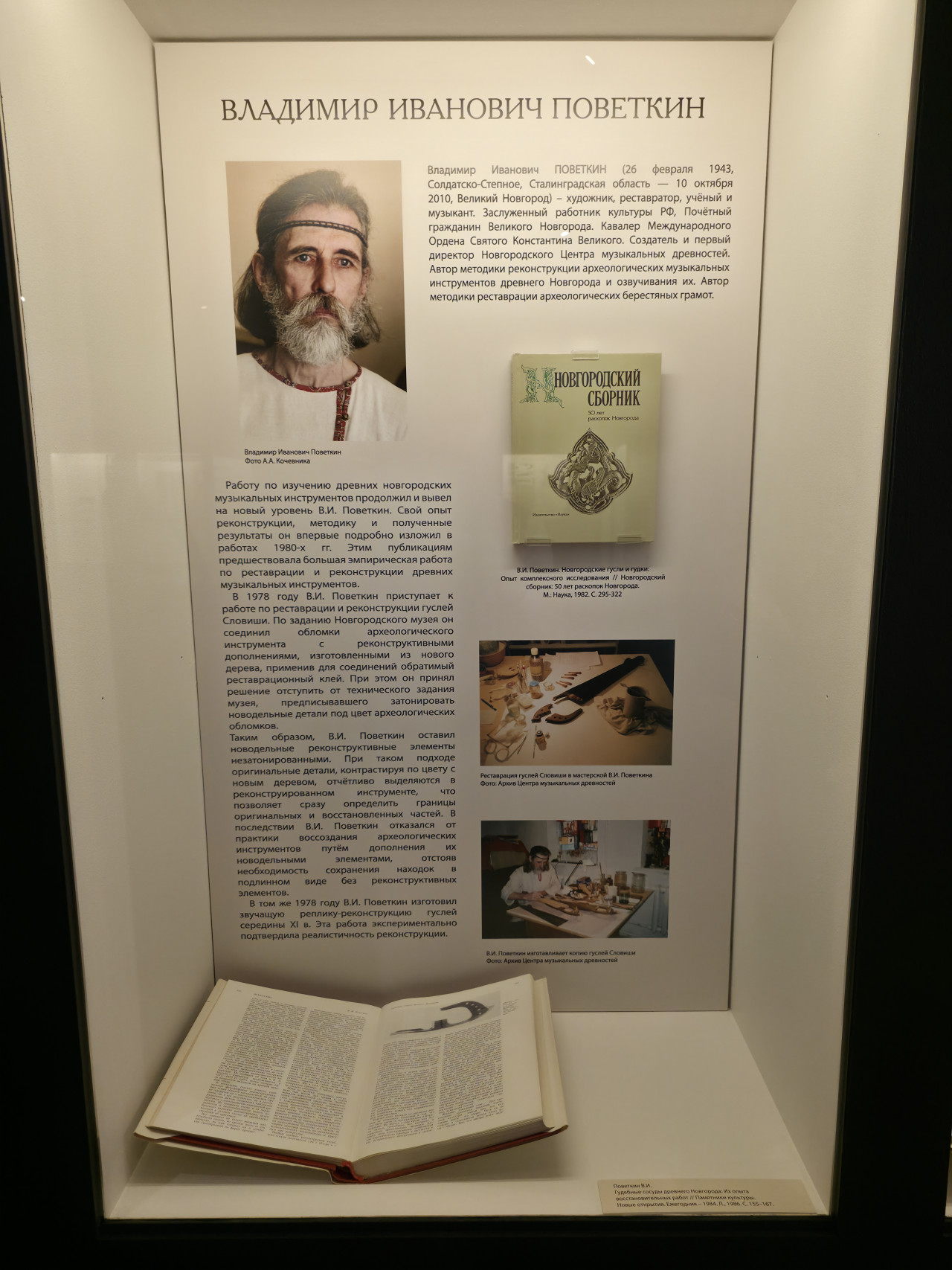Благодаря работам Б. А. Колчина стало известно, что инструмент попал в культурный слой Великого Новгорода в 70-80-х гг. XI в. и ещё в древности был разломан на несколько частей, а его обломки были разбросаны по территории жилой усадьбы, принадлежавшей богатому новгородцу. Степень сохранности инструмента позволила художнику-реставратору, а впоследствии всемирно известному исследователю музыкальных древностей В. И. Поветкину не только восстановить конструкцию и внешний вид инструмента, но и создать звучащие экспериментальные модели, позволившие представить вероятное звучание гуслей XI в. Мультимедийные материалы выставки позволяют посетителям познакомиться с вариантами звучания древнейшей разновидности гуслей.